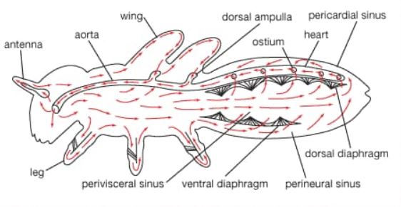 The circulation is accomplished by a tubular heart (dorsal vessel) and a series of mini pumping organs. The alary muscles contract and expand the dorsal vessel to produce a hydrostatic pressure, which pushes the hemolymph forward. It accomplished what our heart does. The hemolymph is pumped forward by the dorsal vessel through the aorta into the head and flows back through the body in the hemocoel. It reenters the posterior heart through the ostia and the cycle repeats. There is yet another thing to clarify: The circulation does not carry oxygen in insects. O2 travels through a system of pipes called the tracheal system. The circulation only transports nutrients, hormones and waste products to the excretory systems. It protects against parasites thanks to the hemocytes and maintains the shape of the body through hydrostatic pressure.